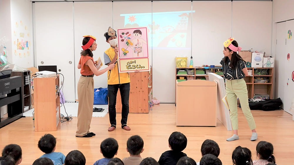 からだの仕組みの説明や、紙芝居の時間になると、真剣に耳を傾けていた園児たち。発表するときは、積極的に前に出て紙芝居の野菜を指さすなど、とても充実した時間を過ごせたのではないかなと思います。