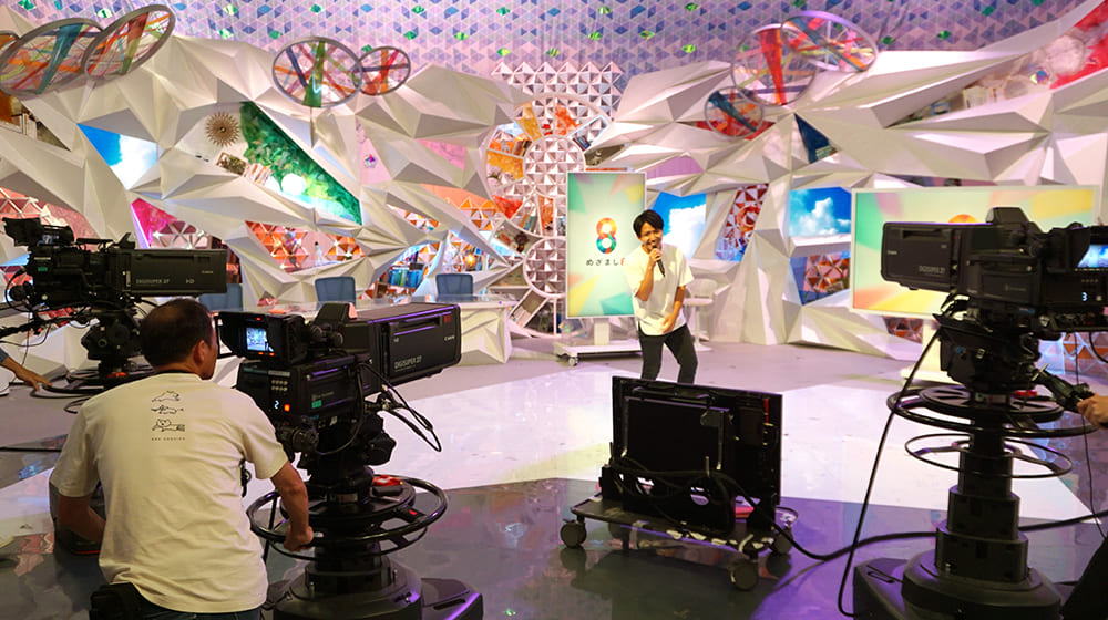 竹内友佳アナウンサーと安宅晃樹アナウンサーのコメントに合わせて、カメラを担いだ子どもが実際に撮影すると、「本物のカメラマンみたい!」と、家族から声援と拍手が送られました。スタジオ全体が盛り上がってきたところで、アナウンサー2人に歌を歌ってもらい、プロのカメラマンによる歌番組の収録を披露。歌に合わせてスタジオを縦横無尽に動き回るプロの技に歓声が沸き起こりました。