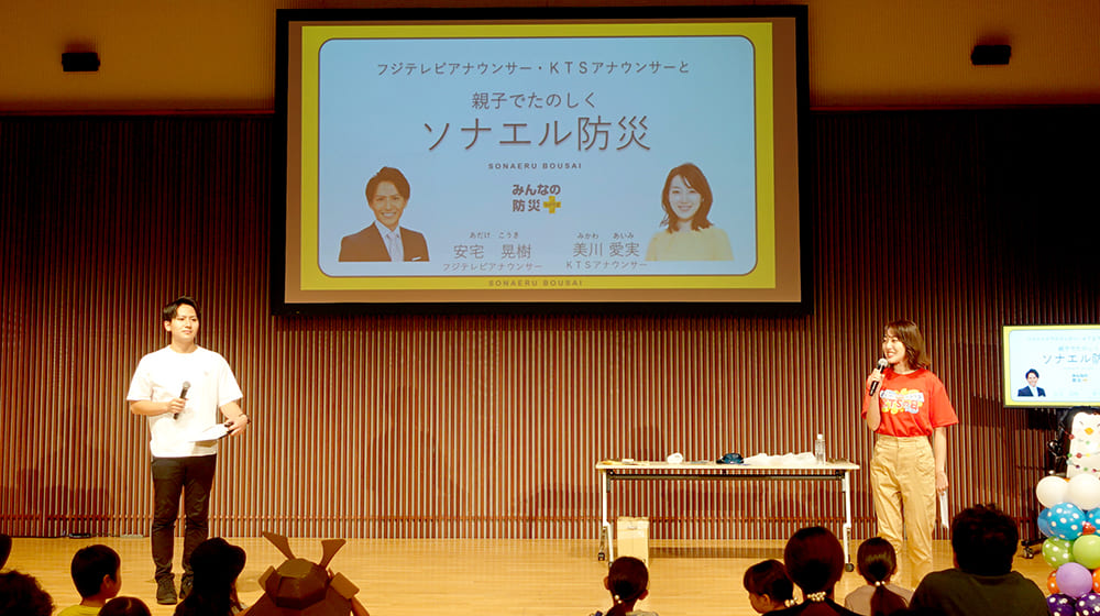 「いつどこで起こるかわからない災害にあったときにどうする?」をテーマにクイズ形式で学ぶ親子向けの防災イベントを9月24日「KTSの日」で実施しました。フジテレビの安宅晃樹アナウンサーと鹿児島テレビの美川愛実アナウンサーと災害への備えについてなどを一緒に学びました。