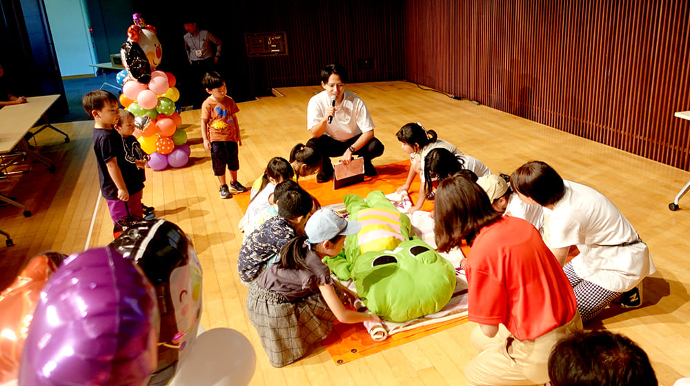 大地震が起こった時には、「どんな備えが必要?」「ライフラインが復旧するにはどのくらいかかるの?」「乾電池は何本くらい必要?」などクイズを交えながら楽しく学んでいきました。2歳(推定)~中学生まで幅広い年代の子どもたちは、クイズの答えに歓声を上げたり、ガチャピンの分身を見て「かわいい~!」と言ったり、まさに“たのしく”学んでいました。 一方、大人の方は、「それだけの防災グッズをどこに収納しようか…」など、子ども以上にリアルに感じてくださっているような表情がとても印象的でした。