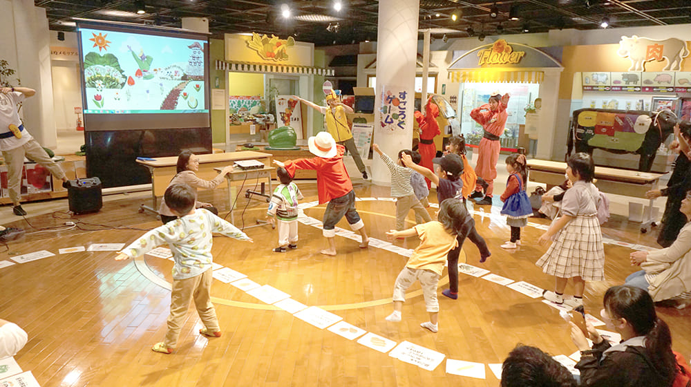 始めは、「子どもたちは恥ずかしがってあまり反応してくれないのだろうか…」と不安に思っていました。しかし、始まると徐々に子どもたちの顔に笑顔が見え、おまじないの野菜探しに夢中になり、みんなの楽しそうな雰囲気に乗って、最後には体操まで思いきり踊っていました。