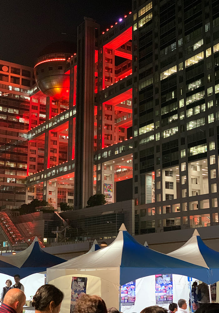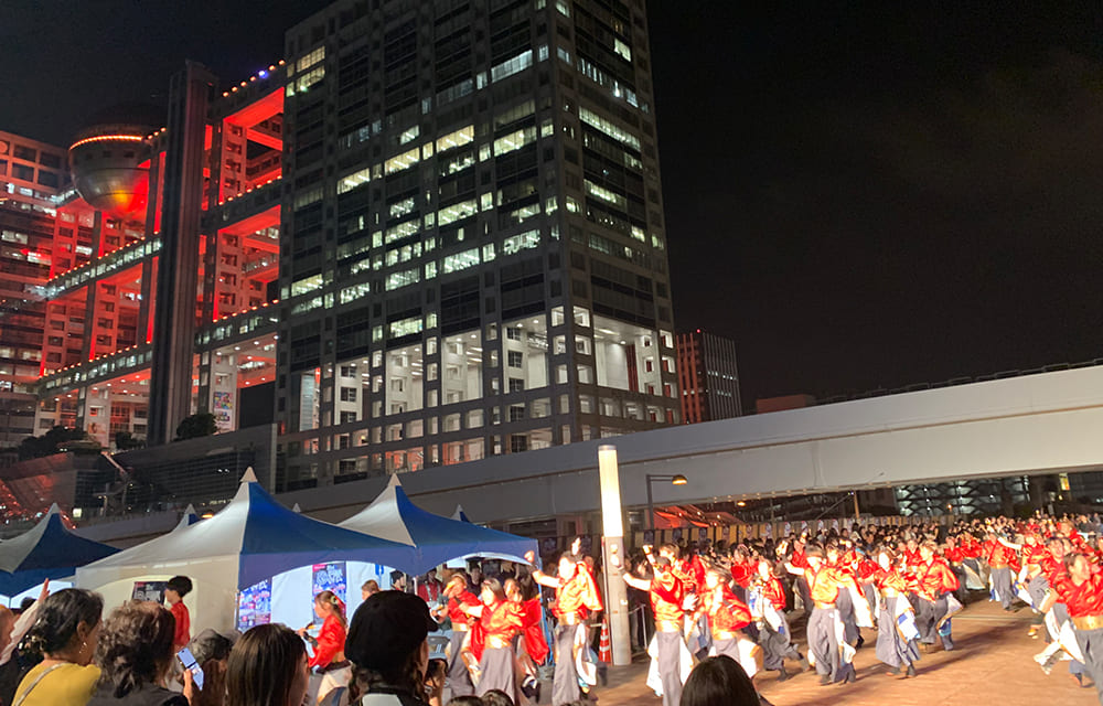11月はオレンジリボン(児童虐待防止)推進月間。11月4日・5日の両日お台場エリアを中心に開催された『第22回ドリーム夜さ来い祭り』はオレンジリボンなどSDGs推進を掲げており、フジテレビはお祭りと連動して1日から5日までの5日間、社屋イルミネーションAURORA∞をオレンジ色に点灯しました。オレンジの社屋をバックに、カラフルな衣装に身を包んだ踊り子たちの掛け声が夜空に響き渡りました。