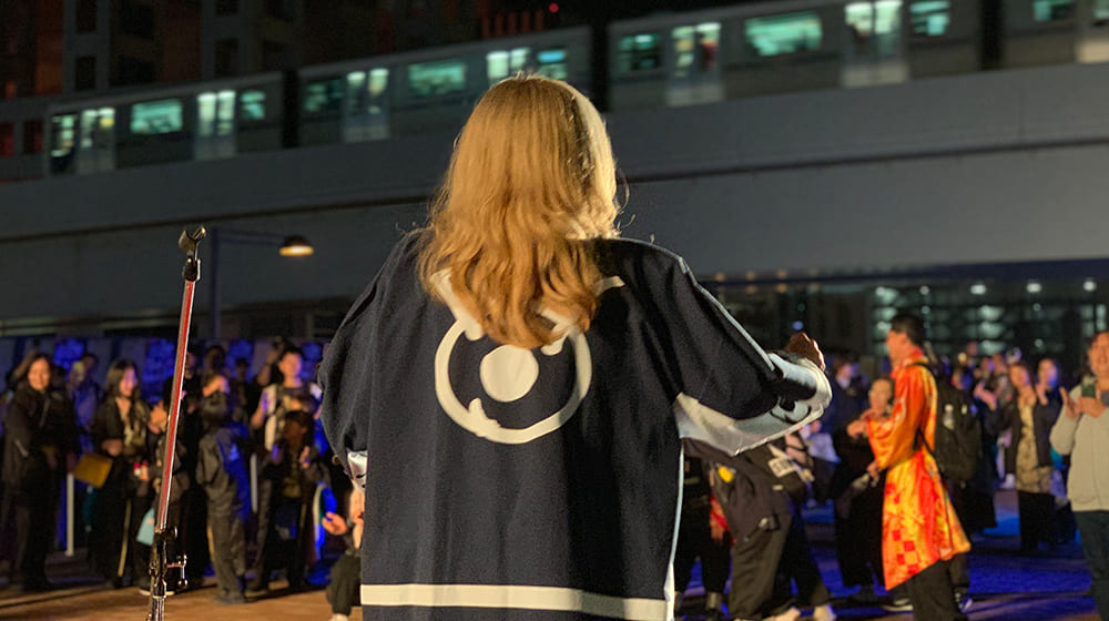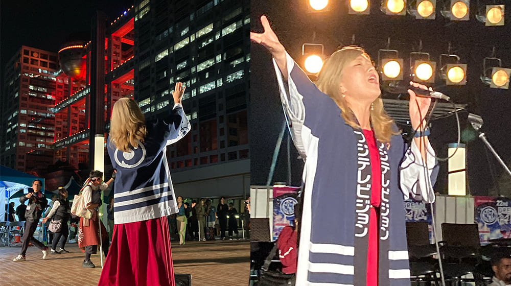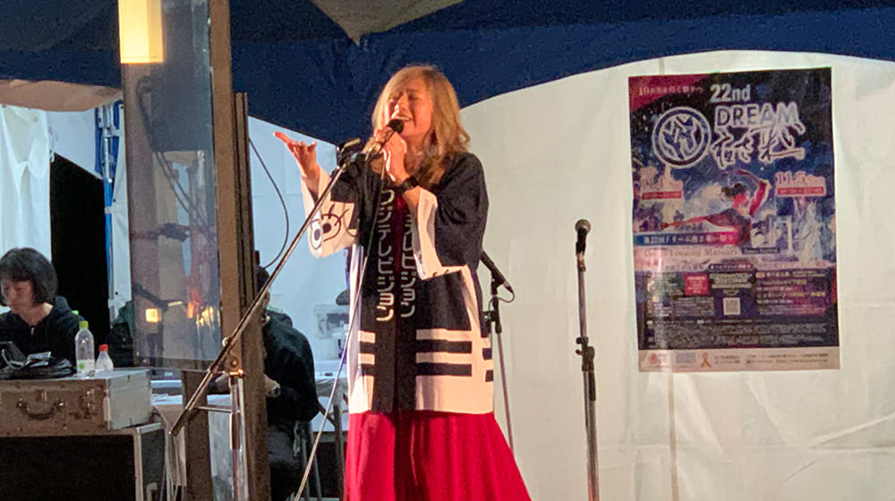 また今年は『FNSチャリティキャンペーン』と『ドリーム夜さ来い祭り』とのコラボレーションが初めて実現しました。『FNSチャリティキャンペーン』は、貧困や飢餓、栄養不良などに苦しむ世界の子どもたちを支援するための募金活動で、SDGsの目標とも合致する取り組みです。お祭りではシンガーの宇海さんが、50周年を迎えたチャリティキャンペーンのイメージソング「WINDY ROAD」を熱唱、パワフルな歌声に会場のボルテージは一気に上がりました。多くの観光客や踊り子たちが歌に合わせて踊り、会場は大変な熱気に包まれました。