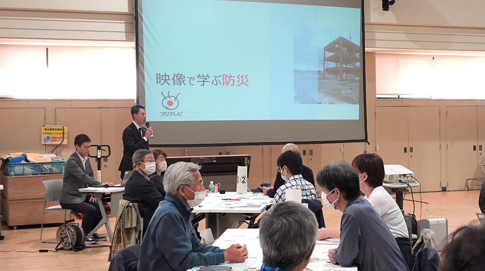 研修では、フジテレビの震災特別番組「わ・す・れ・な・い」で、12年に渡って取材し、放送してきた被災地などの映像を使ってシチュエーション別に検証。自宅、車の中、大きな商業施設、商店街、駅など、そこで何が起きていたのか、その時人々はどんな行動をとっていたのか、そこから何を学ぶことができるのかを、防災士の資格を持つ木村アナウンサーが解説。