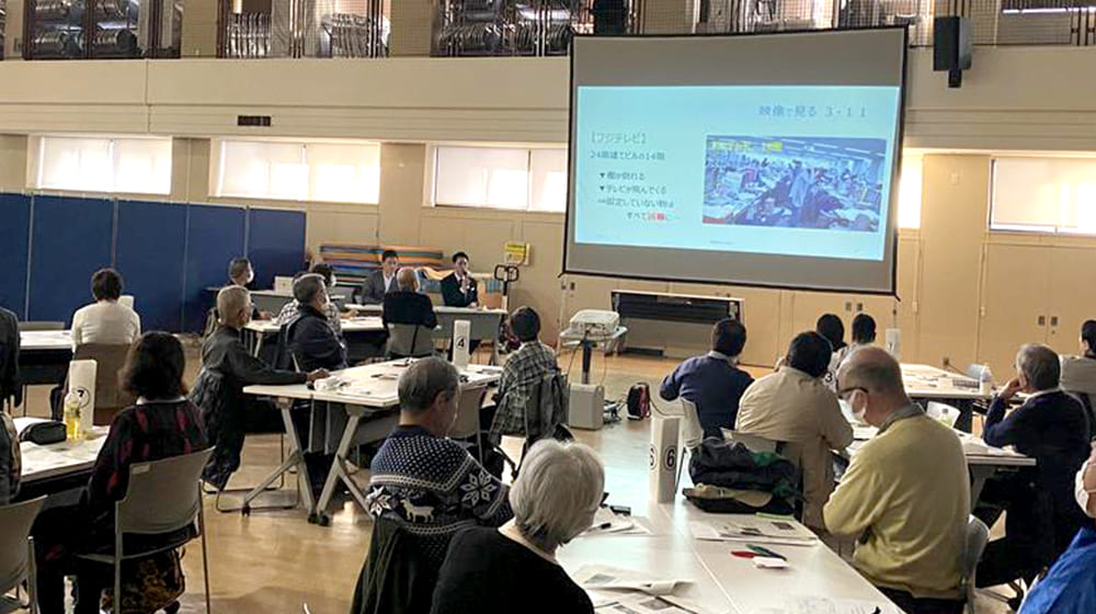 東日本大震災の映像を使い、災害時の行動について説明を行いましたが、私たちから伝えるだけではなく、参加した市民の方々から、疑問や意見を聞くことで、逆に私たちが学ぶこともできました。