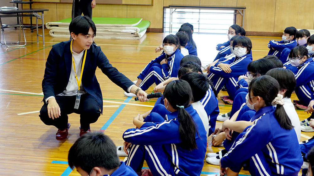 事前に学校の先生からは「おとなしい子が多いかもしれません」とお話を頂いていたのですが、いざ授業が始まると、そんな心配も全く感じないほど、皆さんとても積極的に声を出してくれました。特に発声・滑舌練習では大きな声が体育館に響き渡り、こちらも序盤で汗ばむほどでした。正しい発声方法、スピーチの基本を学んで前半終了。