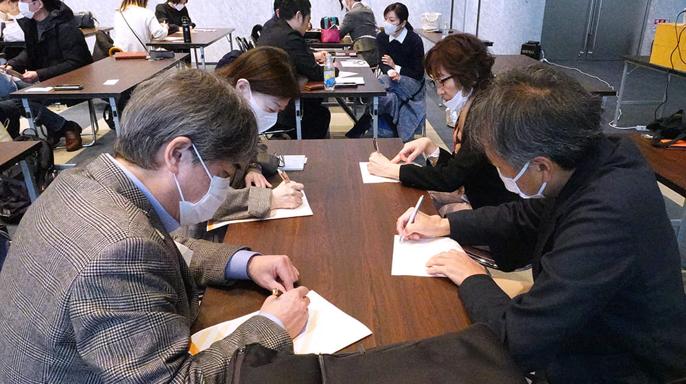 講習会では、薄葉さんご自身の実体験も交えながらお話しして下さり、視覚障害や聴覚障害の方、そして高齢者などの視点に立ち、どうやったら適切な声かけやコミュニケーションを取って行くことができるかなどについてとてもわかりやすく説明して頂きました。講習会では参加者がグループになって話し合う機会が何度も設けられ、皆、話し合った内容を積極的に発表する姿が印象的でした。
