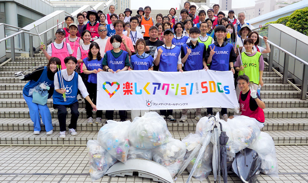 フジ・メディア・ホールディングス傘下や関係協力会社の12社、計56人が、フジテレビ本社屋の周辺を中心に70リットルのゴミ袋11個分に傘4本などを回収しました。