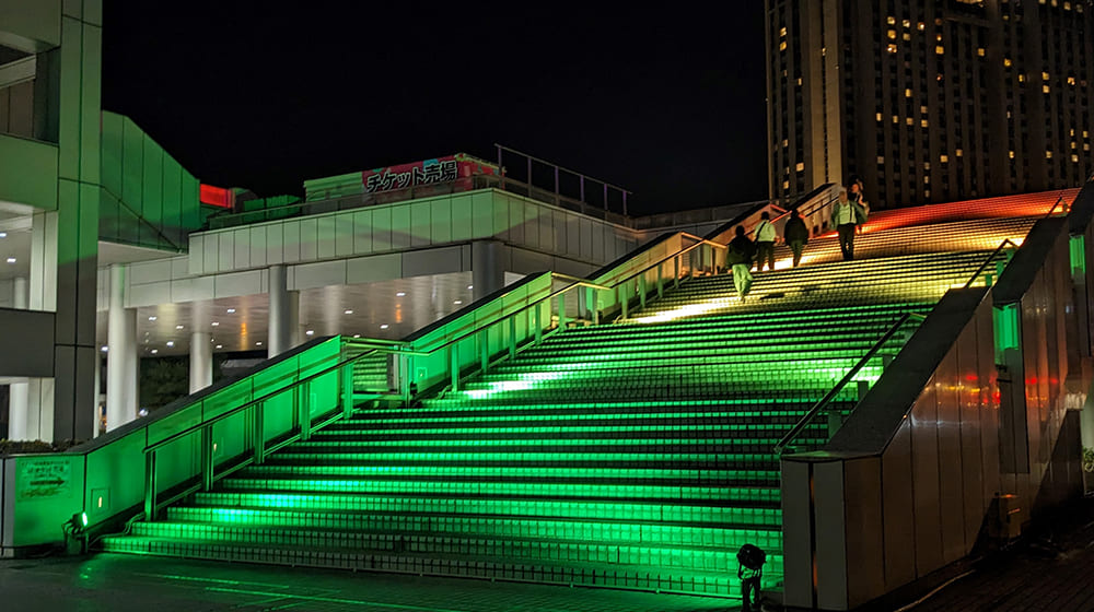 東京レインボープライド開催期間中、フジテレビ本社ビルや大階段などが、多様性を認め合える社会の実現を願ってレインボーカラーにライトアップされました。