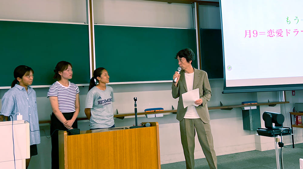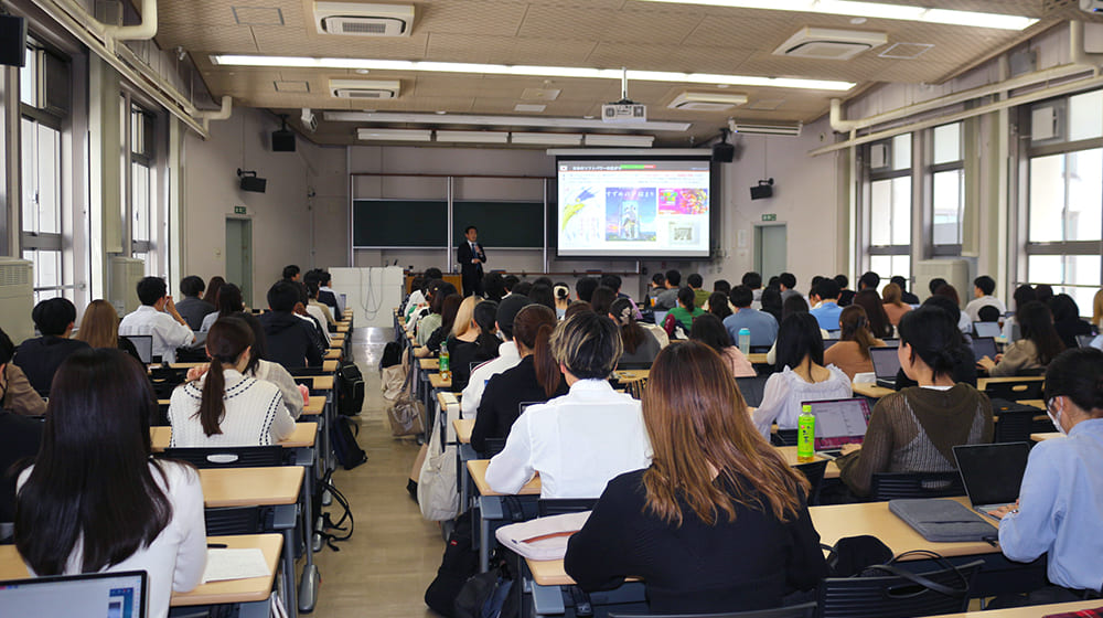 講座の集大成として、学期の最終日にはこれまで学んだことを念頭に、学生から新たなビジネスプランをグループごとに発表してもらいました。審査員として関西テレビ放送の大多亮社長が登壇し、それぞれのビジネス案に対する感想を話しましたが、中には具体的で実現できそうな企画もあり、「レベルが高い!」と大多社長もびっくりする場面もありました。