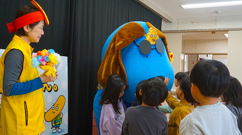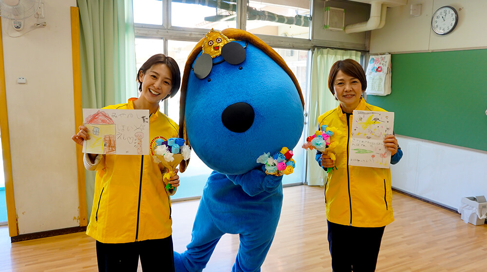 「どっこくん体操」も元気いっぱい!たくさん頭と体を使って、終わった後にはなんと私たちにプレゼントまで。みんなで作った花束と素敵なイラストを送ってくれました。給食の時間は、その日紙芝居で教わった体に良い食材の入ったご飯を食べたそうです。