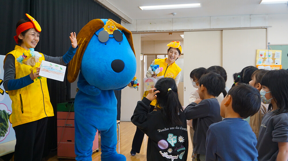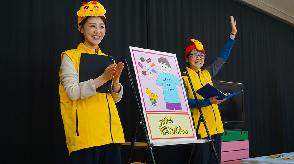 1月31日、調布市立宮の下保育園で食育出前授業『ハロー!どっこくん。』を開催いたしました。今回の先生は、西山喜久恵アナウンサーと宮司愛海アナウンサー。さらに加えて、フジテレビキャラクターのラフくんも登場!