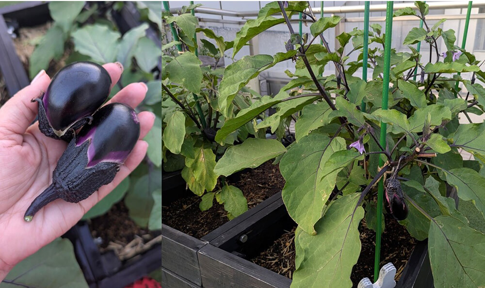 水を大量に必要とするナス。たっぷり水をやることで、小ぶりながらも色艶のいいナスが断続的に収穫できました。社内の人におすそ分けするなど、自然の恵みを分かち合いました。揚げびたしなどにして食べたら、本当に美味しい!