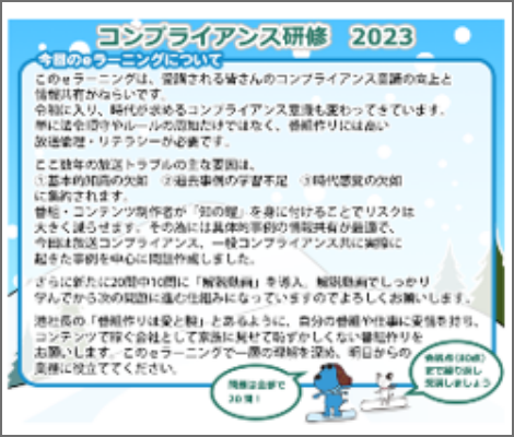 放送コンプライアンス、一般コンプライアンス共に実際に起きた事例を中心に問題を作成、解説動画を入れるなど楽しく学べる研修としています。