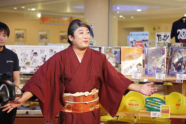 ホテルからユネッサンへ。山本が道中、豆知識と共にユネッサンを紹介。様々なめちゃイケコーナーなどを見つつ、4階のわき売店へ。すると再び大垣節子が従業員を引き連れ現れた。めちゃイケグッズをメンバーに紹介。一番人気のめちゃ桶は、オリジナルの即興CMソングを、息子(の設定)と披露、一同大ウケ。常に仕事にシビアな大垣節子の姿を垣間見た一行は、いよいよ温泉へと向かう。