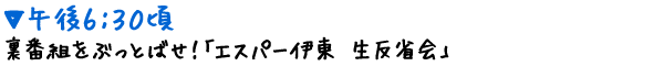 めちゃイケに出ている自分を見ながら遠藤Dと生反省会。しかしめちゃイケが終わると手持ち無沙汰に。遠藤Dの提案で、明日のお台場合衆国での生ライブのリハをすることに、全て新ネタで披露するもほとんどの技を成功させていくエスパー伊東。