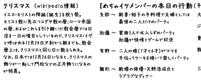 プレゼントを配り終わり、4か月ぶりにゼロスタジオに戻るとそこには、さみしんぼうの紗理奈、濱口、武田、光浦のめちゃイケメンバー4人がサンタコスチュームで待っていた!クリスマスの最後をパーティーとLIVEで飾る。岡村はまだあのヒーローにあったことのない光浦と武田にヒーロー二人をご紹介。43番ロビンマスクとラーメンかむくらマンが再び登場する。パーティーのオードブルは「キムカツ」さんからの差し入れ。ラーメン神座に続き今後もめちゃユルの差し入れをしていただける事になったのだ!ここはNEWヒーローが登場する予感!?