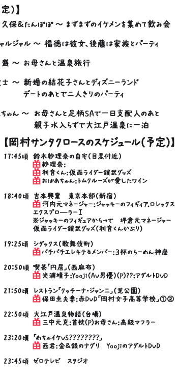 何の予定もないクリスマスが大嫌いな岡村サンタが都内を巡って、寂しいクリスマスを送っている“さびしんぼう”にプレゼントを届けに行きます!メリークリスマス!!
